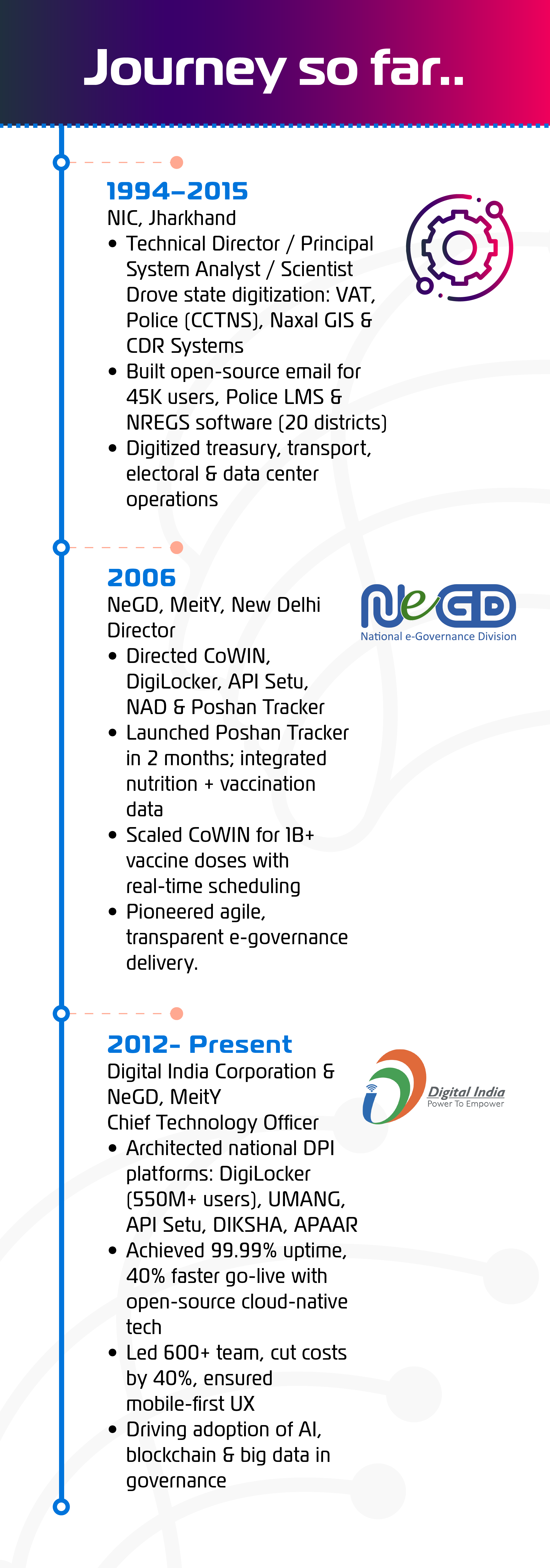 The CTO of Digital India Corporation, Debabrata Nayak, has seen India’s digital journey endto end: from digitizing land records in Naxal-affected districts in the 1990s to nationalplatforms like DigiLocker, UMANG, API Setu and leading CoWin during the pandemic. Hisnext goal is applying AI to citizen services at scale.